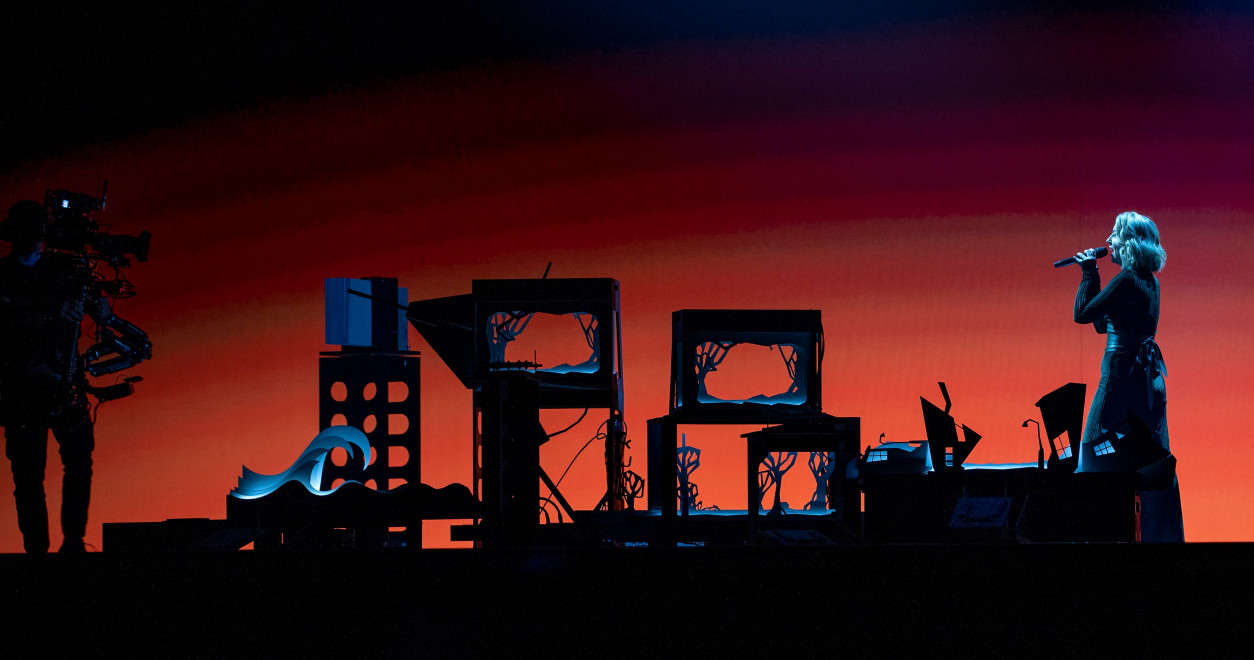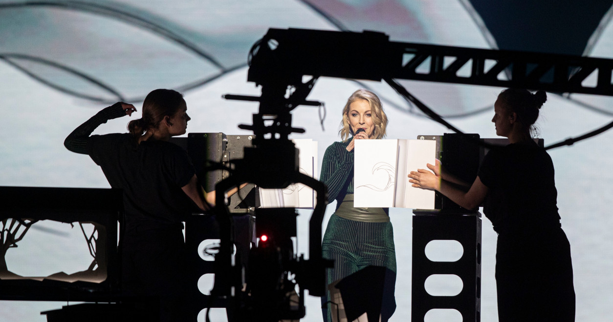 Lesley Roy trägt ein elegantes, dunkles Outfit, das gut zu ihr passt. Anders als andere Acts wirkt sie nicht verkleidet. Auf der Bühne sind verschiedene Pappaufsteller zu sehen, u.a. Wellen und Bäume. Sie läuft, ähnlich wie im Video, durch diese Landschaften. Vor ihr werden zwei Hefte eingeschoben, dessen Seiten wie in einem Daumenkino umgeblättert werden. Was darauf zu sehen ist, wird aktuell noch nicht so ganz deutlich. Scheinbar auch hier ein Wellen-Motiv. Stimmlich bleibt sie leider unsicher. Das kann gut werden, aber auch schrecklich schief gehen.