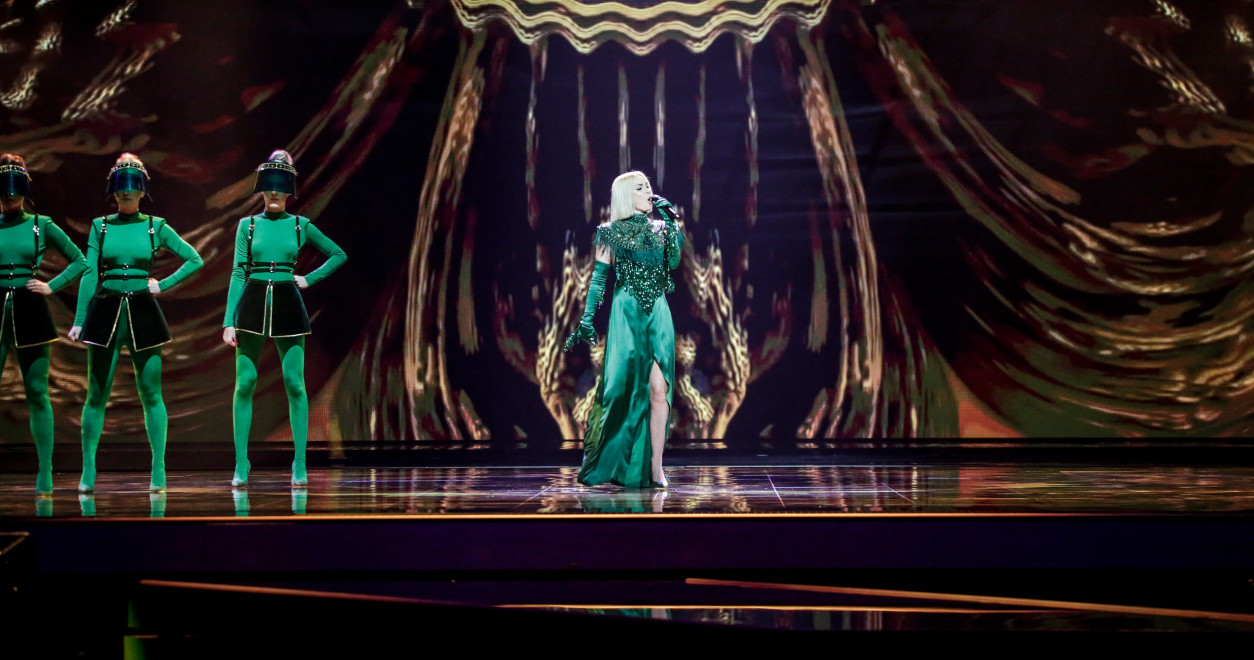 Nach dem ESC werde ich noch lange von Glitzerfransen träumen. Auch Samanta Tina schmückt ihr Outfit mit selbigem. Jedoch trägt sie (zum Glück) keinen Sportbody. Ihr Bühnenkostüm sieht ziemlich ansprechend aus, auch wenn die Fransen auch hier teilweise etwas billig wirken. Sowohl sie als ihre Backgroundsängerinnen tragen dunkelgrün. Einige Tanzschritte, die man aus dem Clip und auch aus Pre-Partys kennt, sind geblieben. So formen die Protagonistinnen mit ihren Händen die Krone. Im Hintergrund sind gold-braune Ornamente auf der Leinwand zu sehen. Ich finde zwar alles sehr ansprechend, aber auch hier wäre noch mehr drin gewesen. Hallo?! Sie singt im ersten Satz des Liedes „The Queen of the night is coming…“. Mit einem größeren „Bäähm“ kann man sich nicht ankündigen. Dieser „Bäähm“-Moment fehlt mir noch, aber dennoch finde ich das, was man sieht, nicht schlecht.