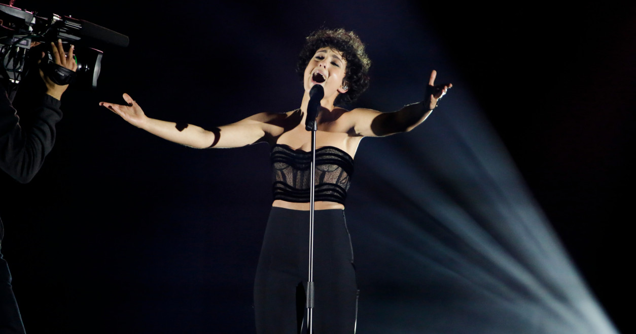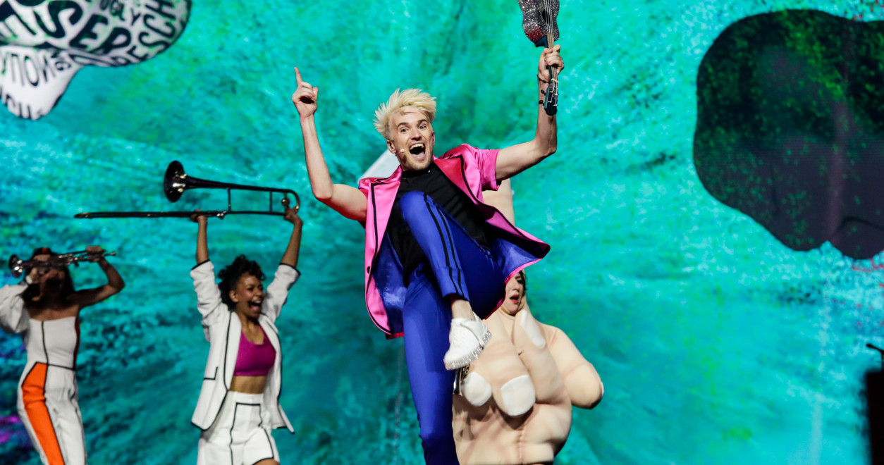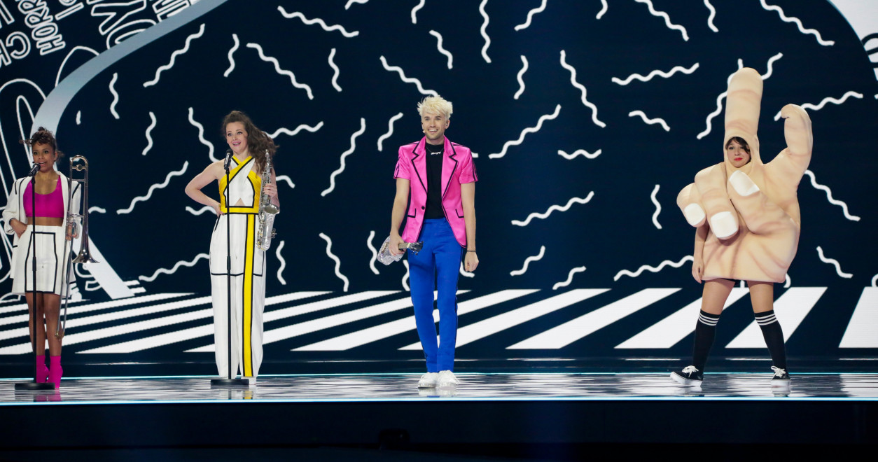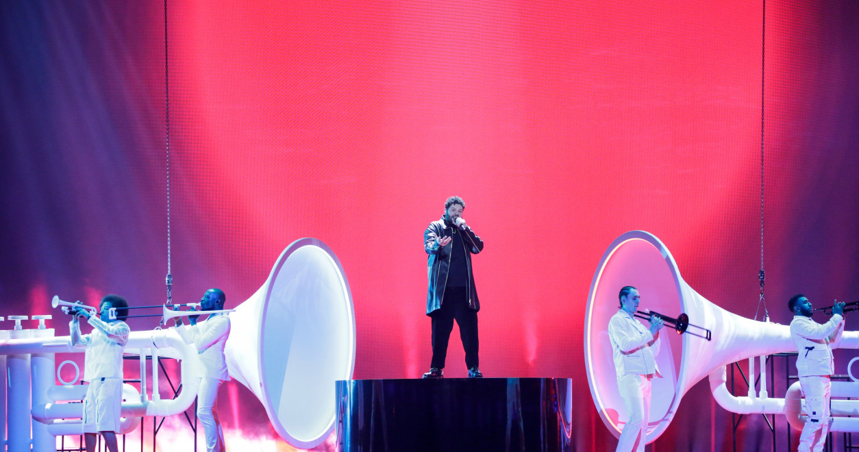 Es folgt James Newman mit seinem Pop-Nümmerchen „Embers“. Man versuchte das Video zu imitieren. Die Farbwahl ist identisch. Man setzt auf überdimensionierte weiße Trompeten als Dekoration. Diese liegen erst auf dem Boden, erheben sich dann aber im Laufe der Show. Kann man machen. Neben James stehen vier Tänzer auf der Bühne, die ganz in weiß gekleidet sind. Diese spielen obendrein die Blaskapelle für ihn. James wirkt zwar noch nicht vollends gelöst, sieht am Ende aber doch recht zufrieden aus. Ich bin noch immer enttäuscht, dass ein Sänger seines Kalibers mit einem billigen Popsong abgespeist wurde. Ich denke nicht, dass das auf der linken Seite der Tabelle landen wird.