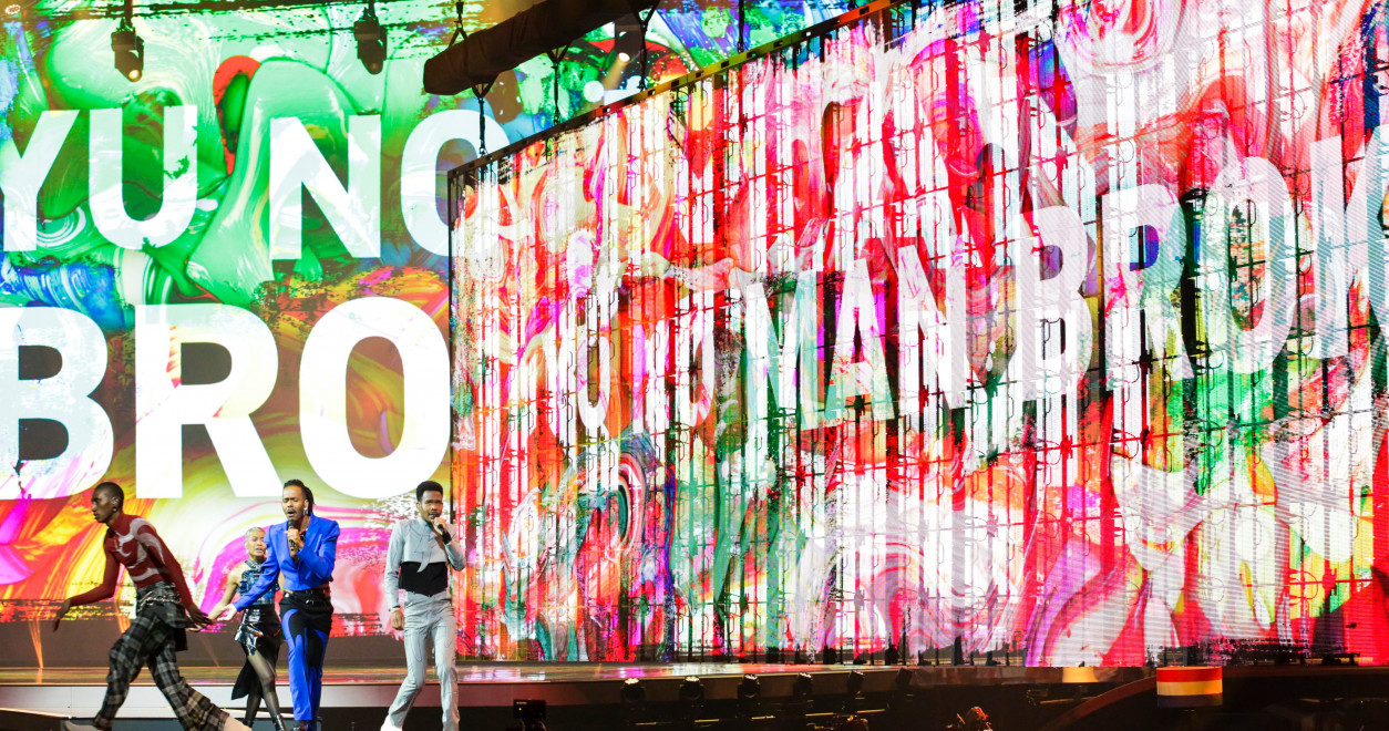 Weiter geht’s mit den Gastgebern. Jeangu trägt ein Outfit, dass ich schwer beschreiben kann. Es ist blau und die Jacke ist so knapp geschnitten, dass er quasi bauchfrei trägt, darunter hat er aber ein Leder-/Latex-Shirt, das mit Löchern versehen ist. Wie gesagt, schwierig zu beschreiben, aber die Bilder zeigen es ganz gut. Jeangu ist wirklich gut und der Auftritt ist durchaus ansprechend, wenn auch simple gestaltet. Es hat etwas bodenständiges, was ich so nicht erwartet habe. Aufgrund des Videos habe ich gedacht, dass Jeangu eine pompösere Inszenierung präsentieren wird. Ich bin nach wie vor kein Fan des Ganzen, aber er wird sein Heimatland großartig repräsentieren und bei der Botschaft ist alles andere auch zweitrangig.